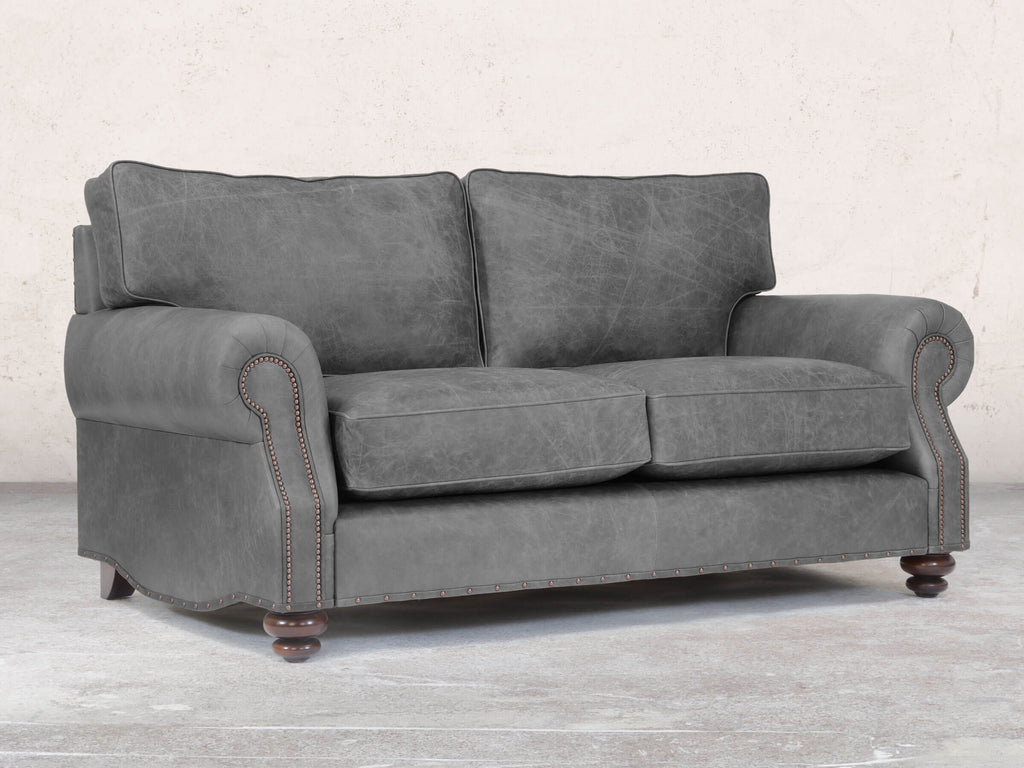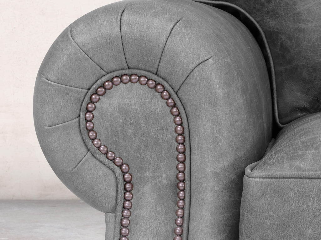 Hetty is a natural evolution of the traditional Chesterfield, designed to introduce more comfort and a relaxed, modern feel. The signature scroll arms have been lowered, and oversized, plush back cushions replace the traditional deep buttoning, creating a sumptuous, supportive feel that both embraces and cradles. The result is an exceptionally comfortable sofa with a clean, higher, box-like profile, while the gentle curves and sculpted detailing in the arms and sides preserve the refined character of the original. Subtle accents such as piping, antiqued studs, and cottage bun feet add a timeless finish that feels both luxurious and inviting. Upholstered in premium leather, Hetty combines modern comfort with enduring elegance. Handmade in the heart of England, every Hetty is made-to-order by our small team of skilled upholsterers using only the finest materials, from the solid hardwood frame and premium reflex foam fillings to carefully selected leather. With more than sixty hours of meticulous craftsmanship in each piece, Hetty delivers unrivalled durability and outstanding comfort.