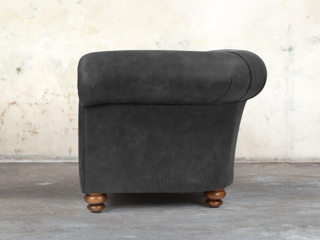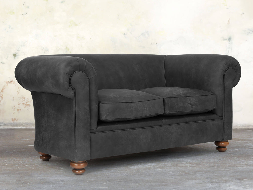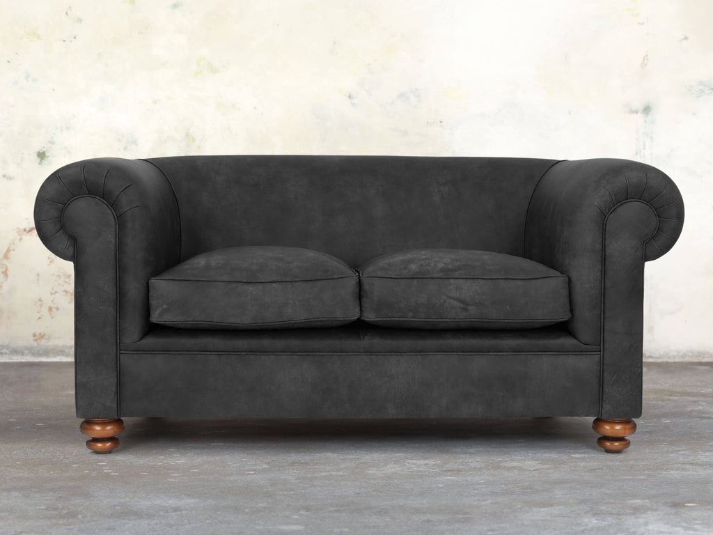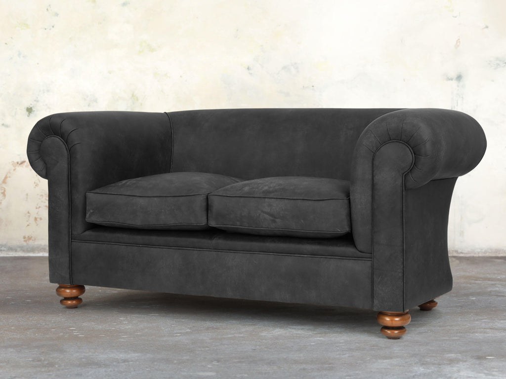 The Jasper 2-Seater Chesterfield is compact, inviting, and luxuriously comfortable. Its solid hardwood frame is filled with soft, squidgy cushioning, no-sag springs, and extra comfort layers. The fully sprung seat and gently sloping back feature a multi-layered deluxe cushion, compressing softly and rebounding to retain its plump shape. Upholstered in hand-dyed Charcoal Soft 'n' Easy Leather, black with slate-grey highlights adds depth and character. Hand-buffed and treated with stain-resistant protection, this sofa combines practical durability with classic Chesterfield style for smaller living spaces.