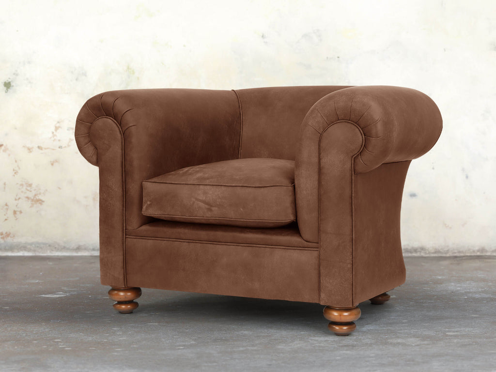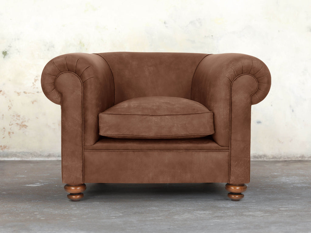 Inviting and supremely comfortable, the Jasper Chair is built on a solid hardwood frame with soft, squidgy cushioning, no-sag springs, and extra comfort layers for lasting support. Its gently sloping back and fully sprung seat feature a multi-layered deluxe cushion, compressing gently and springing back instantly. Upholstered in hand-dyed Hazel Soft 'n' Easy Leather, burnt orange and creamy brown shades highlight its warm, natural depth. The supple, hand-buffed leather finish and stain-resistant technology make this Chesterfield chair as practical as it is luxurious.