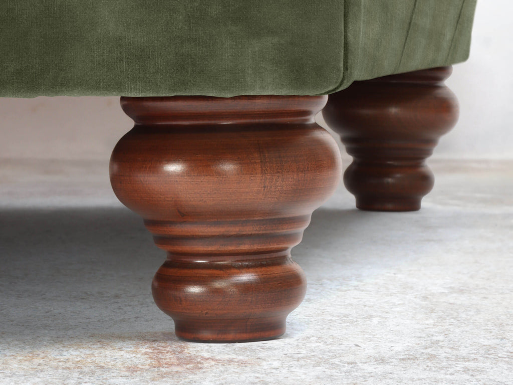 Handmade solid-wood feet in Walnut with a slightly distressed matt finish. Beehive-style to the front and back. Removable if required.