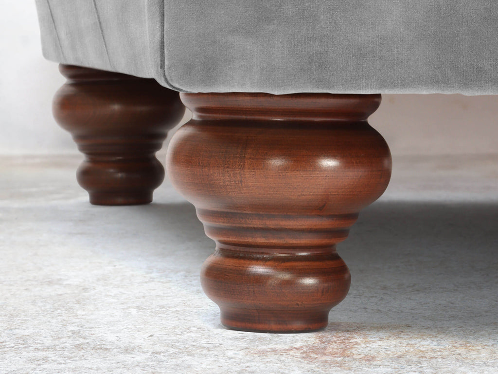 Handmade solid-wood feet in Walnut with a slightly distressed matt finish. Beehive-style to the front and back. Removable if required.