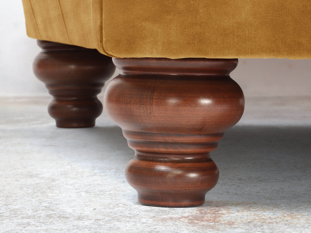 Handmade solid-wood feet in Walnut with a slightly distressed matt finish. Beehive-style to the front and back. Removable if required.