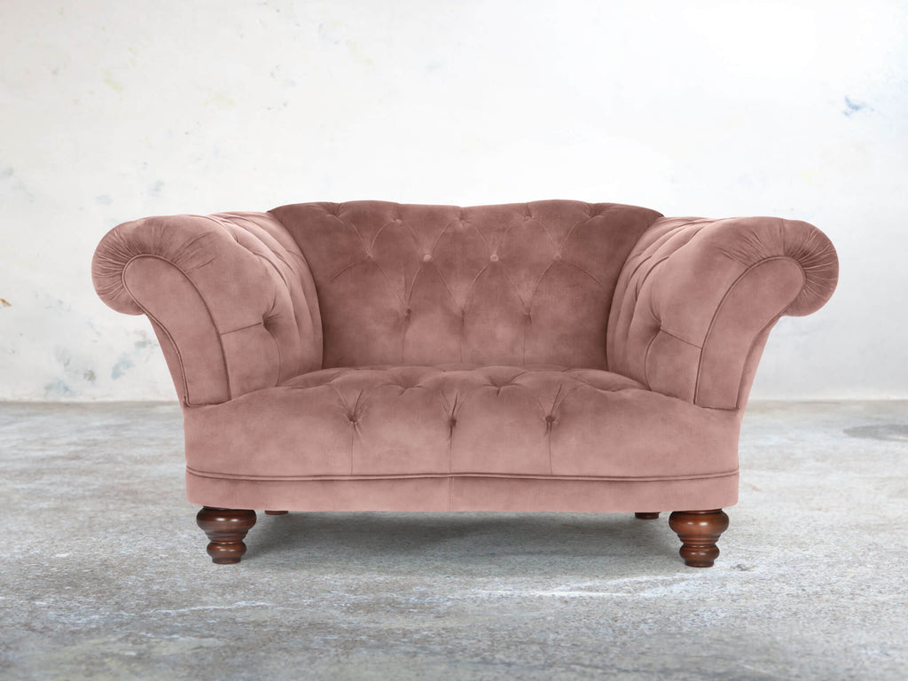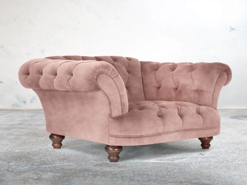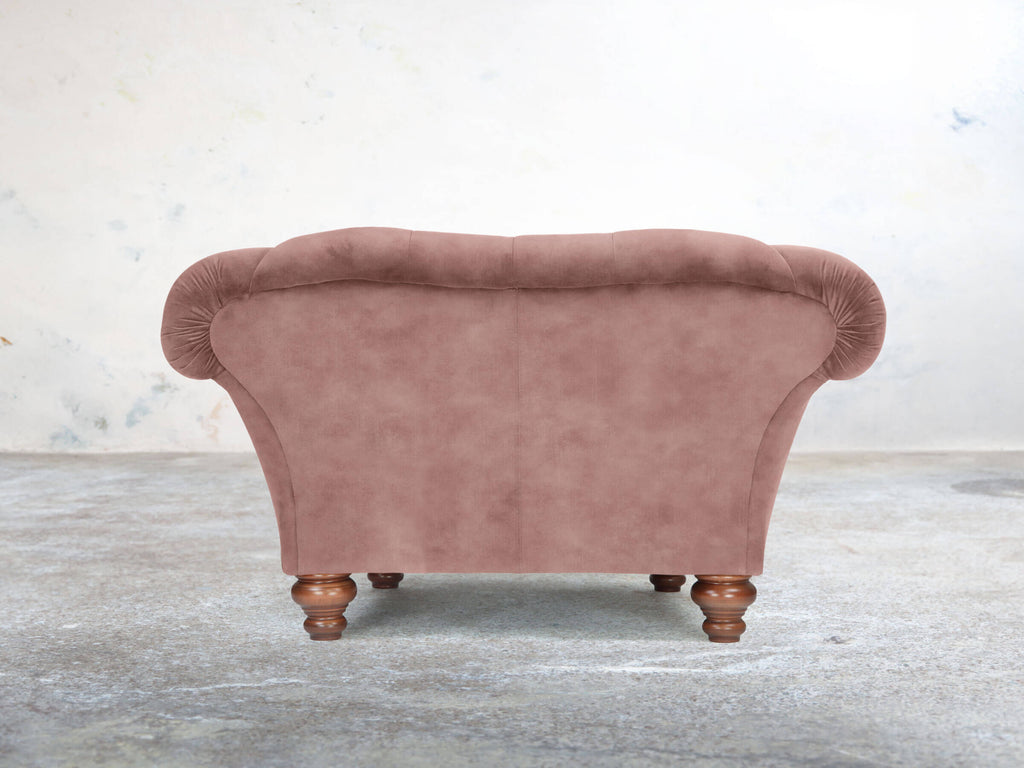 The Oskar Armchair in Dusky Pink Vintage Velvet blends soft, feminine charm with modern Chesterfield style. Deep seats, a low base, and gently reclined back offer an inviting space to relax, complemented by reflex foam cushioning that stays plush over time. Dusky Pink’s multi-layered pile has subtle depth and a delicate vintage pattern. Stain Guard treatment keeps it spill-resistant, easy to clean, and luxuriously soft. Compact yet striking, this armchair brings warmth, character, and everyday practicality to any corner, adding a playful yet sophisticated touch to your living space.