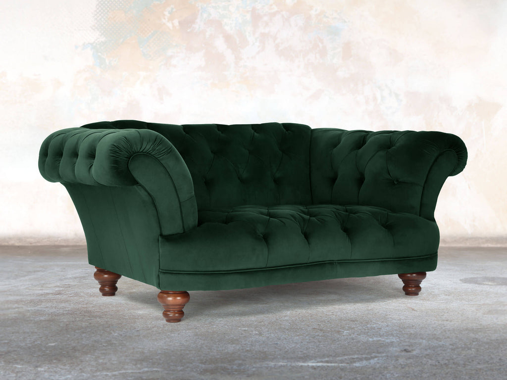 Dark green velvet envelops the Oskar Snuggler, creating a rich, intimate seating experience. Its deep seat, gently reclined back, and plush reflex foam cushioning provide luxurious comfort, while the short pile reflects light, adding depth and subtle highlights to the fabric. Handcrafted in England with a solid hardwood frame, the sofa balances Chesterfield elegance with practical durability. EasyClean technology protects the velvet from spills and dirt while maintaining softness. Ideal for cosy corners, the dark green Snuggler combines sophisticated design, sumptuous texture, and timeless style, creating a luxurious, inviting focal point.