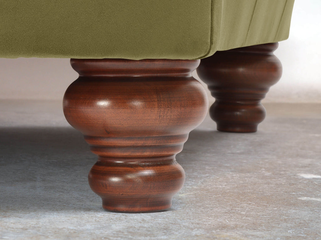 Handmade solid-wood feet in Walnut with a slightly distressed matt finish. Beehive-style to the front and back. Removable if required.