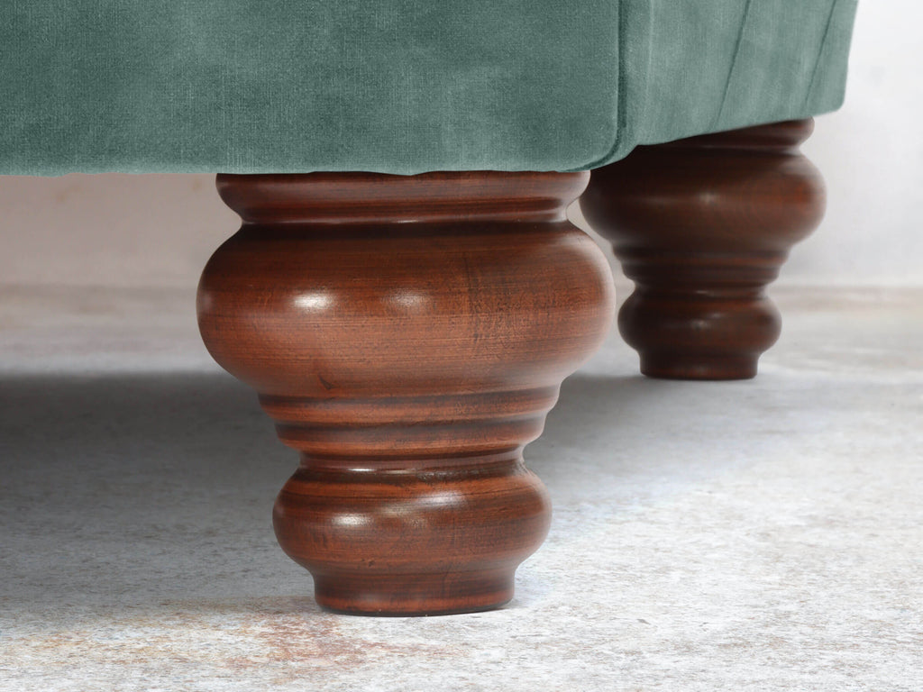 Handmade solid-wood feet in Walnut with a slightly distressed matt finish. Beehive-style to the front and back. Removable if required.