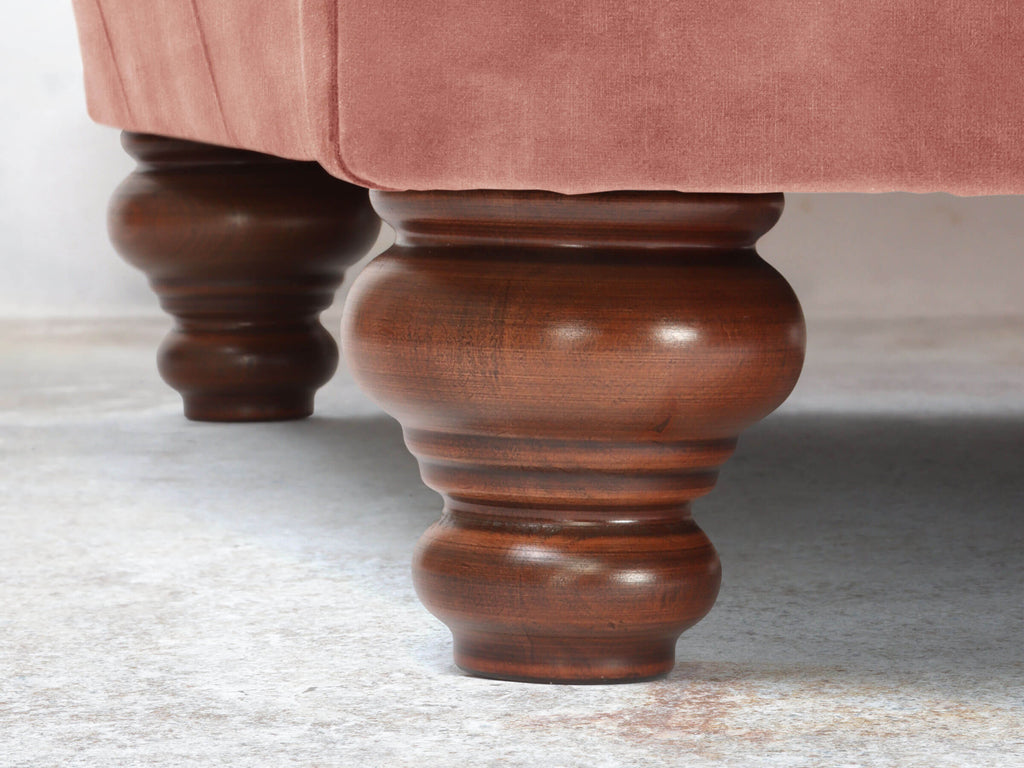 Handmade solid-wood feet in Walnut with a slightly distressed matt finish. Beehive-style to the front and back. Removable if required.